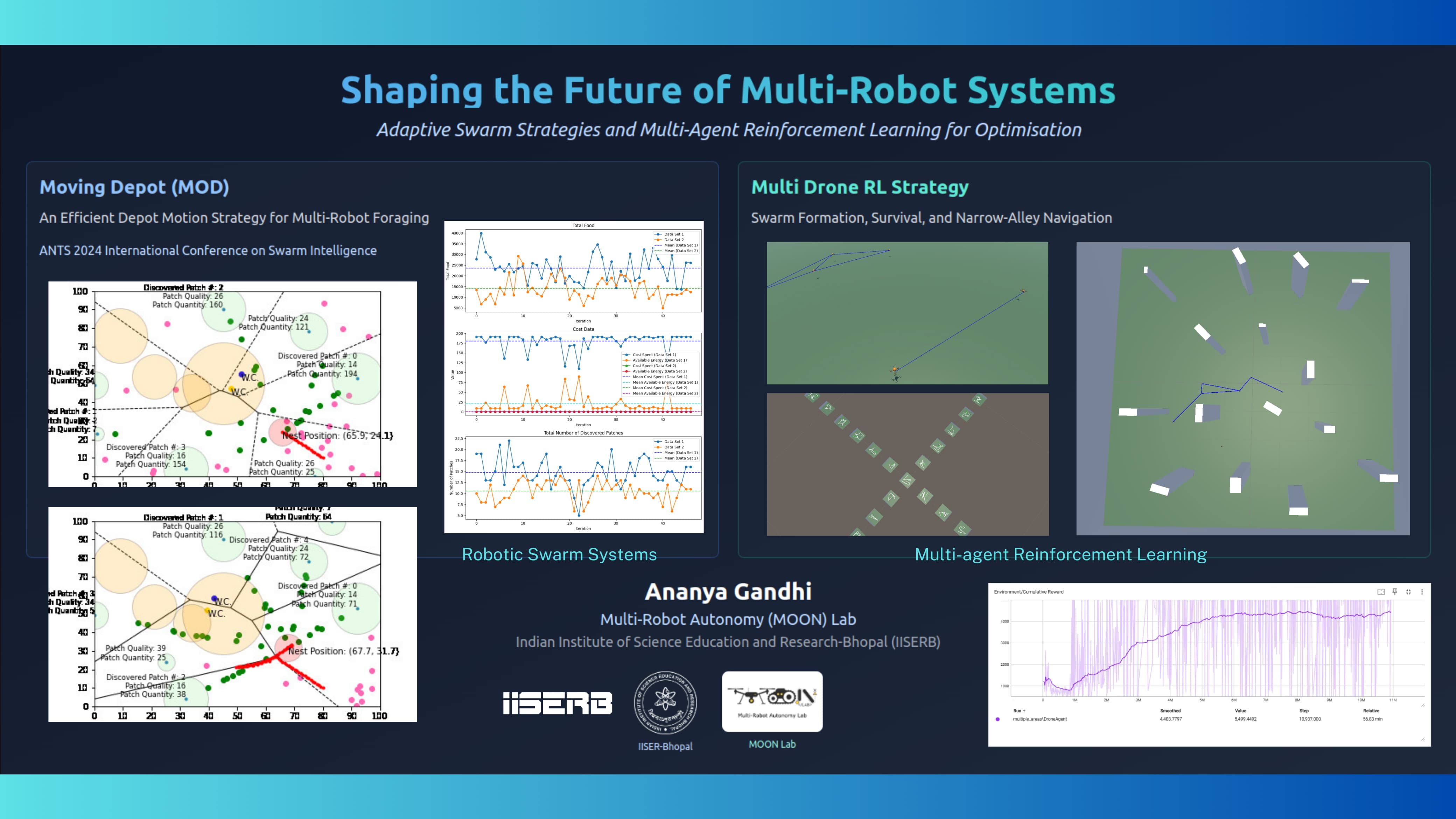I graduated as a Master's student in the BS-MS dual degree program at the Indian Institute of Science Education and Research (IISER) Bhopal, where I was a member of the Multi Robot Autonomy Lab (MOON Lab). I was advised by Prof. Sujit PB. My major was Electrical Engineering and Computer Science. And I hold a minor in Data Science Engineering. My academic interests include robotic swarm intelligence, multi-agent reinforcement learning, computational social choices, computer vision, and quantitative finance.